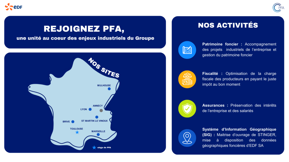 Avec leur siège à Toulouse et des antennes sur le territoire national, les équipes du Centre de Compétences Patrimoine Fiscalité Assurances (CCPFA) accompagnent la stratégie foncière d'EDF. En assurant un rôle d'appui-conseil essentiel, elles contribuent notamment à la maîtrise de la fiscalité patrimoniale locale de l'entreprise. Dans le domaine Assurances, elles interviennent dans les procédures de recours contre tiers (dommages aux biens de l'entreprise, atteinte corporelle des salariés) ou de responsabilité civile d'EDF.