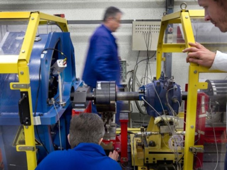 - Modular, large-scale test bench configuration that is unique in Europe (EURoPE test bench): the 40-tonne concrete mass positioned on spring-loaded boxes supports a 10-tonne metal frame 10 m in length, enabling the motor (66kW variable speed from 0 to 3,000rpm) and bearings to be positioned. The shaft line is made up of several parts, with a total length of 3.2 m. It is supported by two hydraulic bearings. The test bench can be extended up to 10m for a 3-bearing configuration and three couplings.