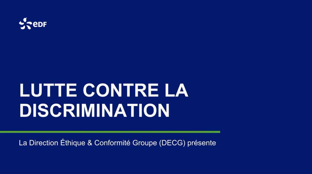 [Animation sans voix-off de la Direction Éthique & Conformité Groupe (DECG) qui présente les fondements de la lutte contre la discrimination au sein d'EDF et les dispositifs associés.]