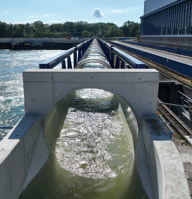 Focus sur la passe à poissons de Rhinau sur le Rhin. Elle a récemment été mise en service et figure parmi les plus grandes de France et d'Europe. Une autre passe à poissons, de même taille, sera mise en service courant 2026 à Marckolsheim, également sur le Rhin.