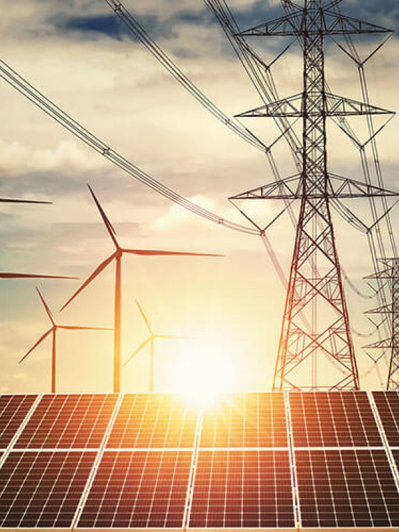 - Panneaux solaires au crépuscule, en arrière-plan éoliennes et pylone THT - Crédits : lovelyday12 / Shutterstock