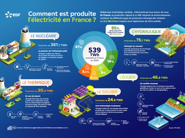 Ça vous dirait un support gratuit pour présenter la production d'électricité en collège et lycée ? A la demande d'enseignants, nous avons réalisé un poster dédié au nucléaire, l'hydraulique, l'énergie éolienne, la production d'électricité thermique, l'énergie solaire et la production d'électricité neutre en CO₂.