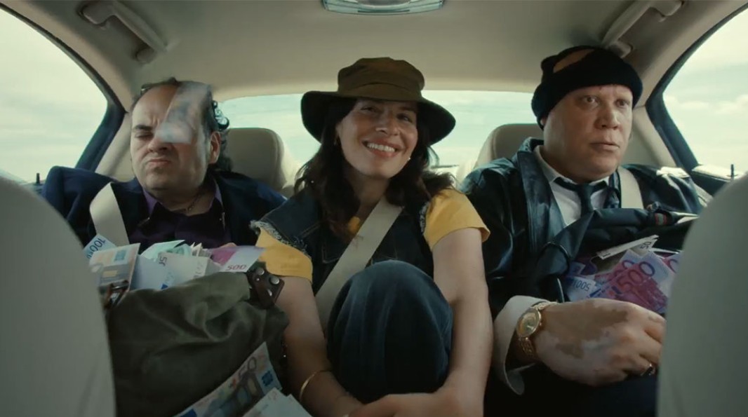 À l’intérieur, quatre gangsters cagoulés entourés de sac avec des billets de banque qui s’envolent autour d’eux. Le visage d’Eva s’illumine—enfin ! Elle monte dedans avec enthousiasme et on la voit repartir, sur le sièges arrière de la voiture entre 2 des gangsters.