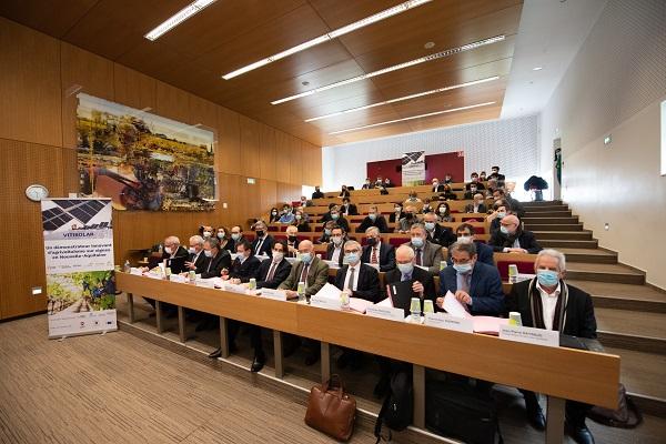 Le Groupe EDF au travers d’EDF Renouvelables et de la R&D a signé le 18 février près de Bordeaux l’accord de consortium avec ses partenaires lançant officiellement le projet photovoltaïque innovant, Vitisolar. Cette signature a été également l’occasion de visiter aux côtés des financeurs principaux du projet l’Ademe et la Région, la parcelle ou sera implanté le futur démonstrateur sur le site de la Grande Ferrade d’INRAE-Nouvelle-Aquitaine-Bordeaux. Concilier production d’électricité décarbonnée et protection des vignes face au réchauffement climatique, tel est l’objectif de ce projet emblématique pour le Groupe.