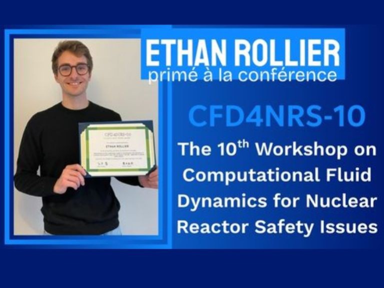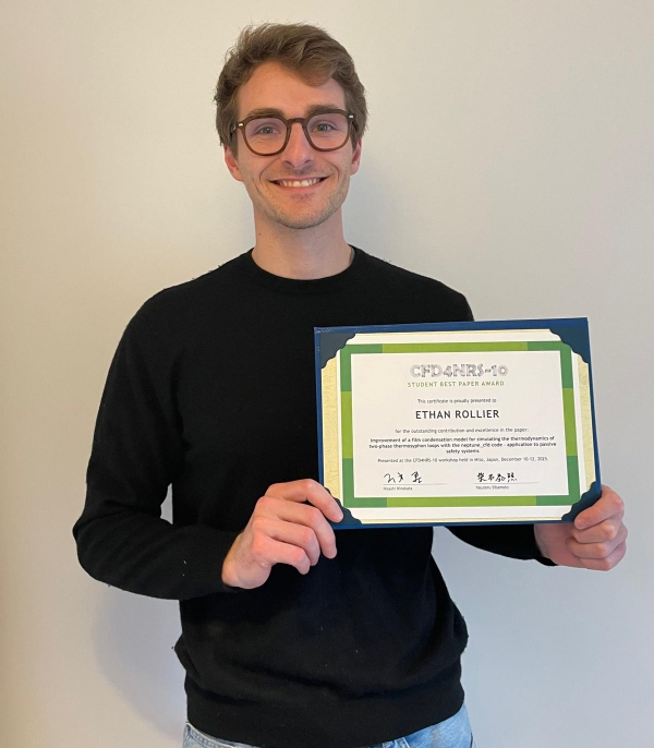 Ethan Rollier, doctorant à la R&D d'EDF, a été récompensé par le prix du meilleur article étudiant lors de la conférence internationale CFD4NRS (Computational Fluid Dynamics for Nuclear Reactor Safety), pour ses travaux portant sur la modélisation du phénomène de condensation, implémentés dans le code de référence neptune_cfd. Une belle reconnaissance de son travail de recherche appliqué aux systèmes passifs de sûreté en centrale nucléaire.