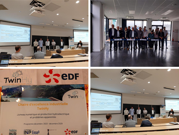 La Chaire TwinHy a pour objectif de mener des recherches relatives au développement de jumeaux numériques, afin d’améliorer la performance des aménagements hydroélectriques. Les travaux de la chaire, auxquels contribue la R&D, doivent permettre d’anticiper et d’améliorer la gestion de l’exploitation et de la maintenance de nos ouvrages hydroélectriques. L’inauguration de la Chaire d’Excellence Industrielle TwinHy a eu lieu le 22 janvier 2026 dans les locaux de l’ENSE3, en présence de nombreux acteurs du monde académique et scientifique, et de représentants des différentes entités EDF contributrices.