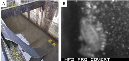 A) Échappatoire à amphibien installé dans un bassin d'orage de la centrale thermique de Dirinon ; (B) Grenouille verte (Pelophylax sp.) prise en photo au sommet de l’échappatoire à l’aide d’un piège photographique (Reconyx) © Antonin CONAN - R&D d'EDF