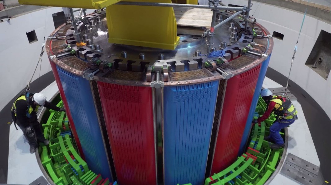 mètres de haut et 7,5 mètres de diamètre pour un poids de 330 tonnes, a été assemblé sur la plage de montage, au coeur même de l’usine. Il a été mis en place le 30 novembre dernier dans son logement définitif : une enceinte blindée en béton, d’une épaisseur de 80 cm. En parallèle, le rotor est arrivé sur le chantier en pièces détachées et a été assemblé puis mis en place à l’intérieur du stator.