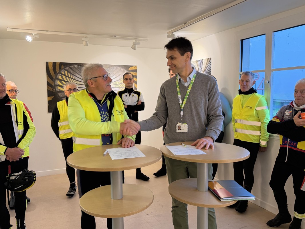 Le groupe de cyclistes solidaire a été accueilli par Nicolas Cayet, directeur de la centrale, qui a tenu à souligner l’importance de leur engagement et à apporter le soutien de la centrale à cette action, en reversant un don financier de 1771,28 € au profit du Téléthon.
