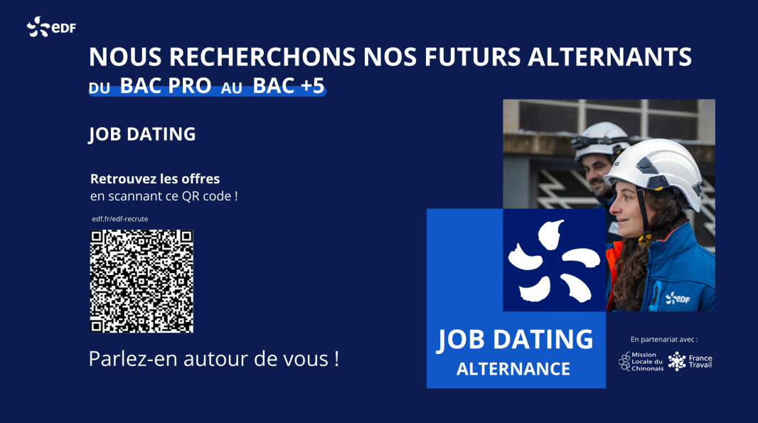 La Mission Ressources Humaines du CNPE de Chinon organise son job dating alternance annuel le mercredi 25 mars, de 13h30 à 18h30, en salle Confluence.