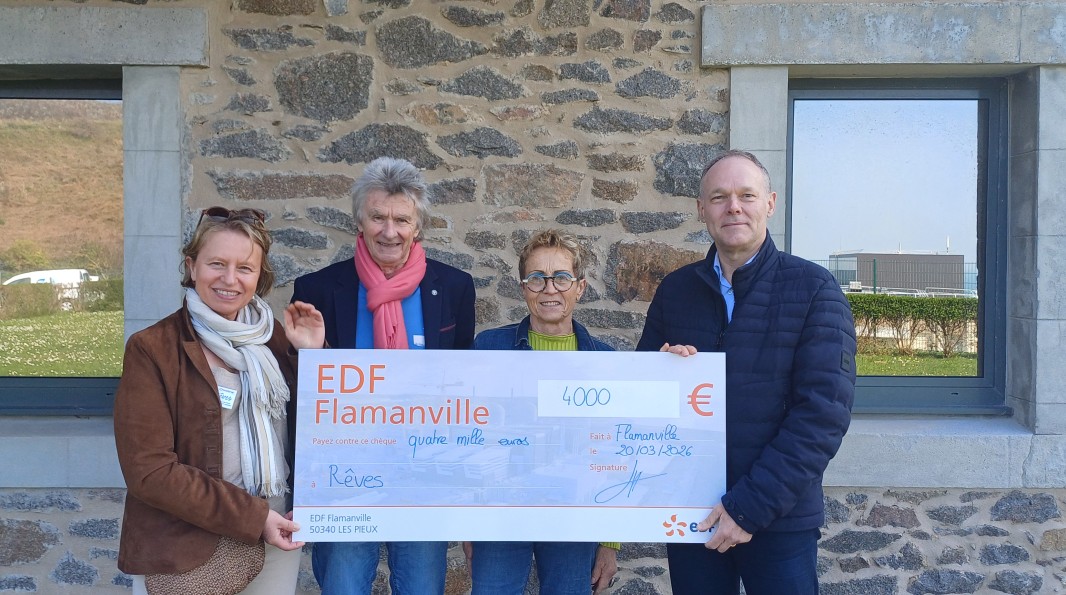 C’est dans ce cadre que le président Gérard Couillard, accompagné de deux bénévoles, ont été accueillis par David Le Hir, directeur de la centrale de Flamanville 1&2, le 20 mars 2026 sous le soleil de flamanvillais. Ce dernier lui a remis un don de 4000 € qui financera les rêves des enfants malades de l’association.