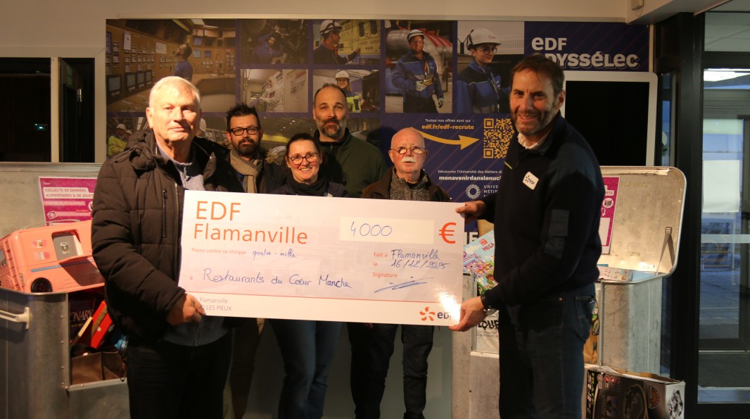 Pour cette fin d’année 2025, la centrale EDF Flamanville et l’entreprise Onet se sont associées pour un geste solidaire. Une collecte de dons par les salariés a été organisée. Le 16 décembre 2025, Grégory Heinfling, directeur du site de Flamanville 3 a remis un chèque de 4000€ au profit des Restos du Cœur. Le fruit de la collecte du site a également été déposé dans les camions des Restos.