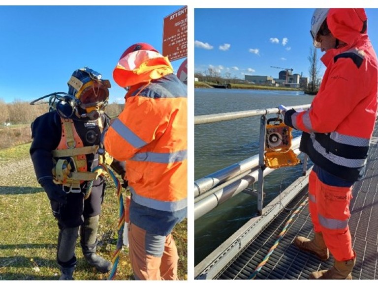 « L’inspection est réalisée sous l’eau, mais également en surface (contrôle des caillebotis…). L’intervention nécessite de la préparation et le strict respect des règles de sécurité liées aux activités de plongée (bouteille de secours, surveillance du scaphandrier… )», explique Ludivine, chargée d’affaires et de consignation au service Logistique Prévention des Risques et en charge du pilotage de ce chantier.