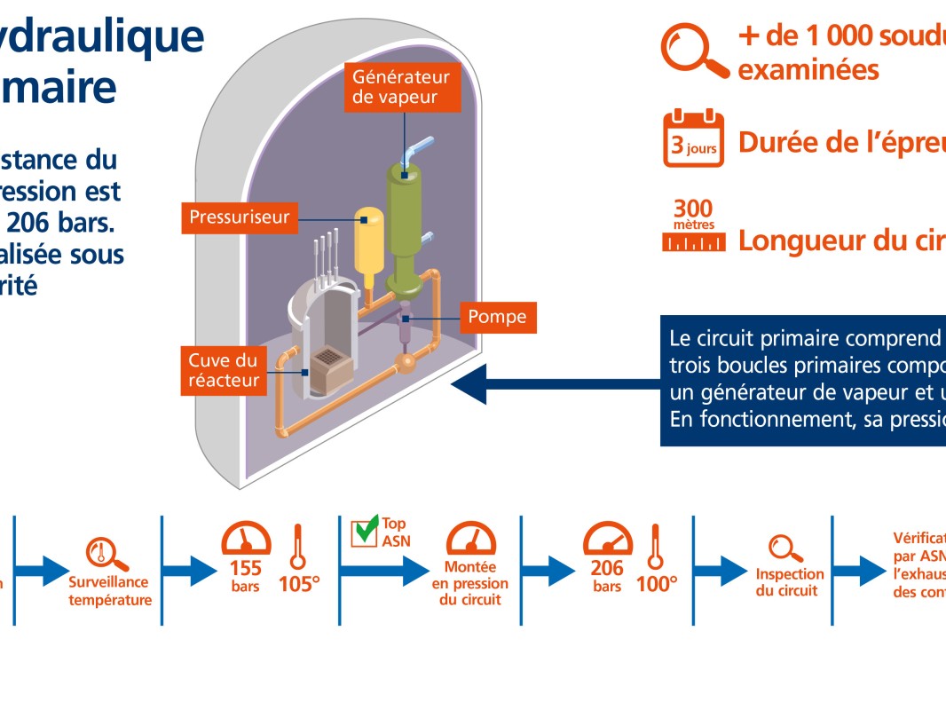 Effectuée en présence de l’Autorité de Sûreté Nucléaire et de Radioprotection (ASNR), cette épreuve consiste à mettre sous pression le circuit primaire à 1,3 fois sa pression habituelle de fonctionnement, soit 206 bars.