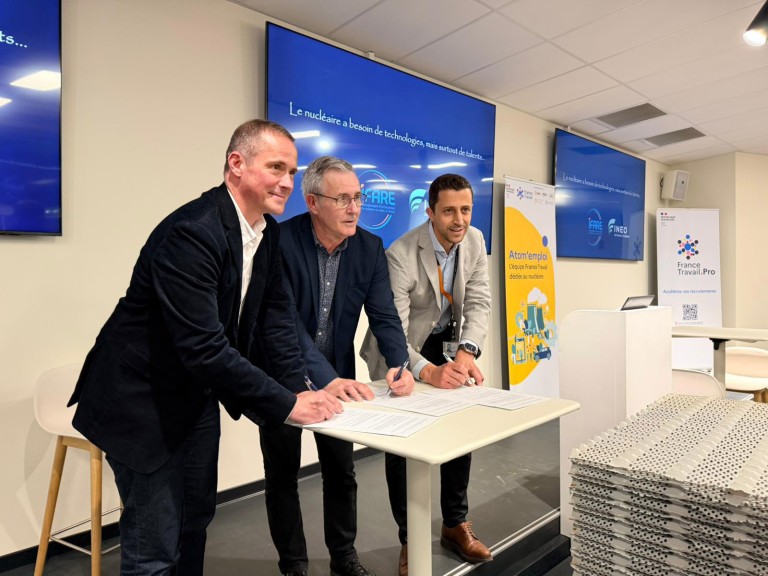 Le 13 mars, à l’occasion de la semaine du nucléaire, trois acteurs clés du territoire : Nouredine el Messaoudi, Directeur du CNPE de Cruas-Meysse, Lionel Boudrit, Président de l’Ifare et Wilfried Faure, Directeur départemental de France Travail Ardèche, ont signé une convention de partenariat pour faciliter l’accès à l’emploi dans la filière nucléaire.