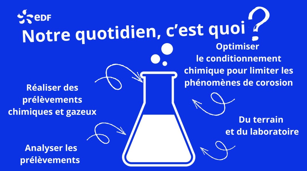 Chacune de ses journées est marquée par une grande variété d’activités. Ses tâches sont multiples et exigent une attention constante. Le chimiste intervient aussi bien sur le terrain, pour effectuer des prélèvements dans les circuits, qu’en laboratoire, où il réalise des analyses précises pour garantir la conformité des paramètres chimiques.